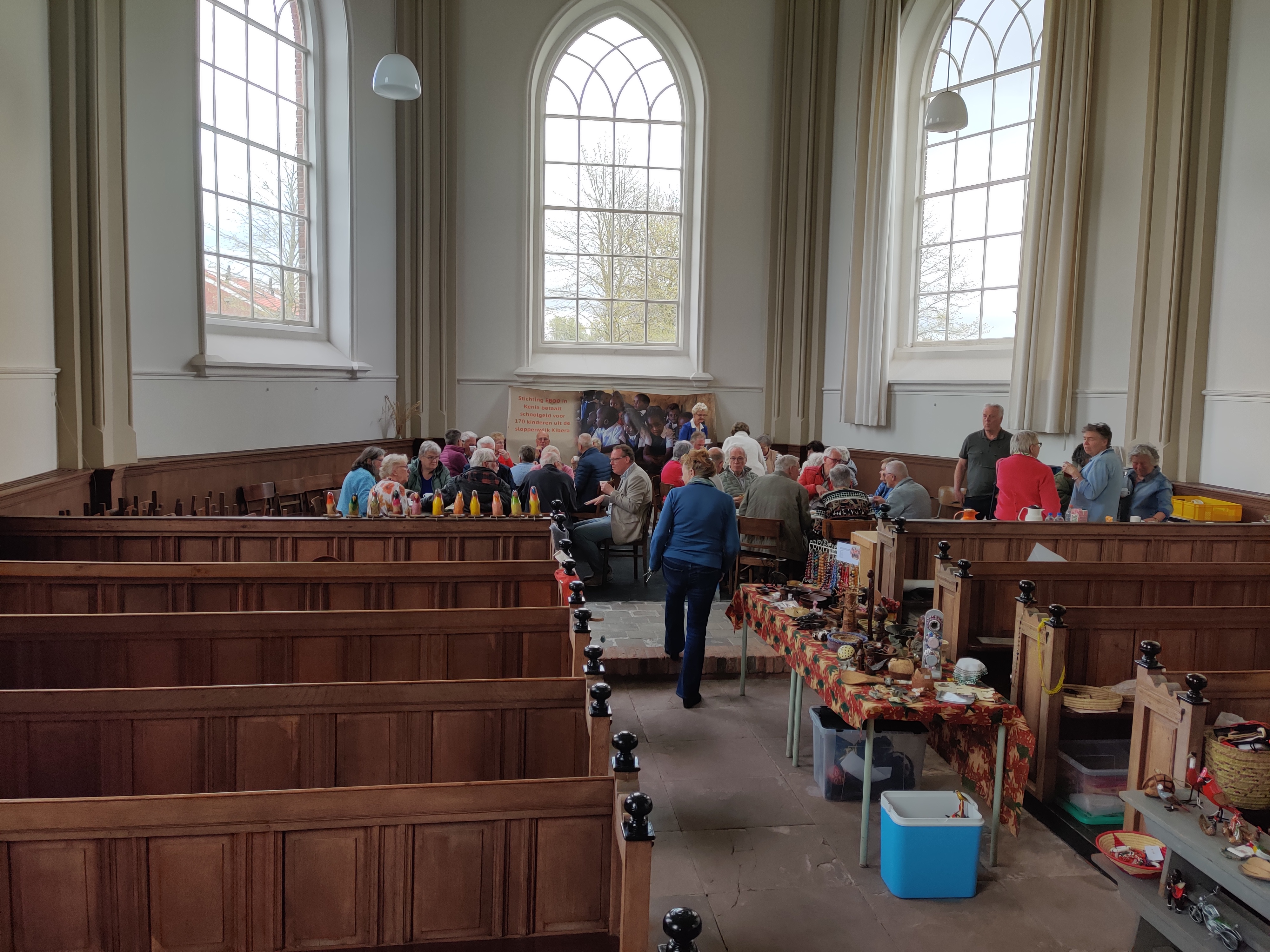 Na de dienst vertelde Fenneke Dijkema over het werk van EBOO in Kenia. 15 jaar geleden woonden zij en haar man in Nairobi, toen de vrouw van de tuinman vroeg of zij hun konden helpen met het naar school sturen van hun kinderen. In Kenia moeten kinderen speciale schoolschoenen en uniformen dragen om naar school te mogen en natuurlijk hebben ze ook schoolboeken nodig. De mensen met de laagste inkomens kunnen dit niet betalen. Fenneke besloot het gezin te helpen. Toen ze hierover schreef op haar blog, reageerden al snel familie en vrienden dat zij ook wel een kind wilden helpen naar school te gaan. Zo ging het balletje rollen en werd er al snel een hele groep kinderen ondersteund. In Nederland werd een officiële stichting opgericht en na een tijdje werden niet alleen basisschoolkinderen geholpen, maar werd er ook steun geboden voor de middelbare school, vakopleidingen en de universiteit. Inmiddels heeft EBOO ruim 350 kinderen/jongeren geholpen met hun opleiding! Van de (inmiddels) jongvolwassenen die zij geholpen hebben, hebben velen een baan. Sommigen betalen nu het schoolgeld voor hun jongere broertjes/zusjes of ze helpen zelf als vrijwilliger bij EBOO.