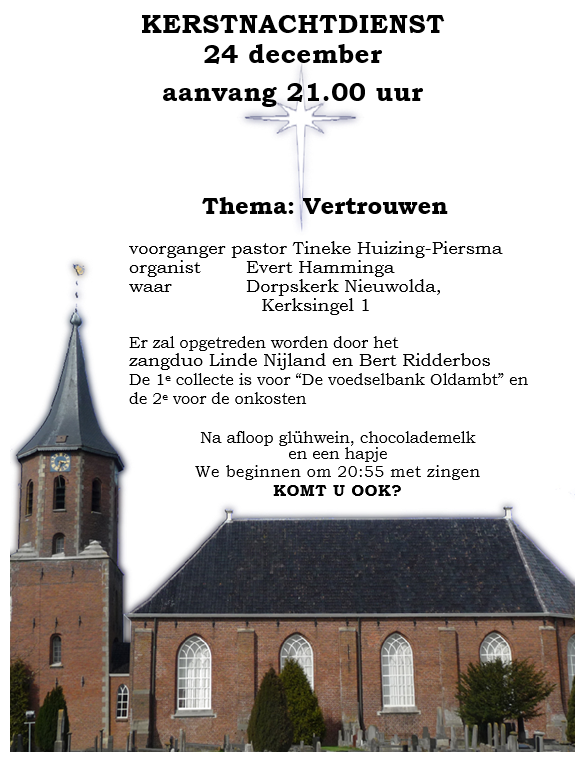Op 24 december Kerstavond houden we de traditionele Kerstnachtdienst in de Dorpskerk te Nieuwolda. Er klinken mooie orgelklanken en de bekende liederen worden vanaf tien voor negen gezongen.