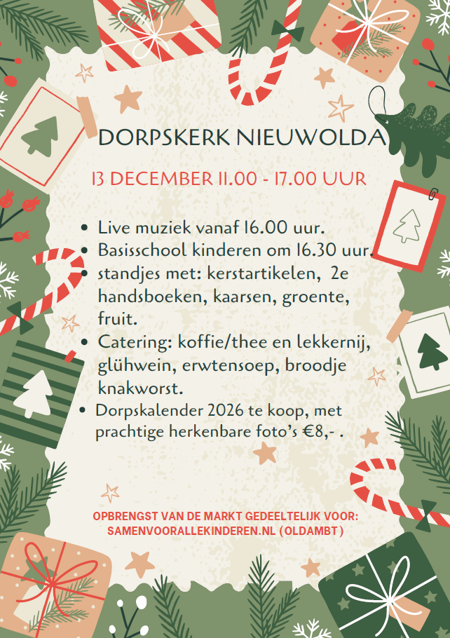 ![]() Zaterdag 13 december wordt er in de Dorpskerk in Nieuwolda een kerstmarkt gehouden, georganiseerd door de Culturele Kerkcommissie. Op de markt vind je verschillende lokale ondernemers met mooie producten. De opbrengst is deels bestemd voor Sam& voor alle kinderen. Van harte welkom! | ||