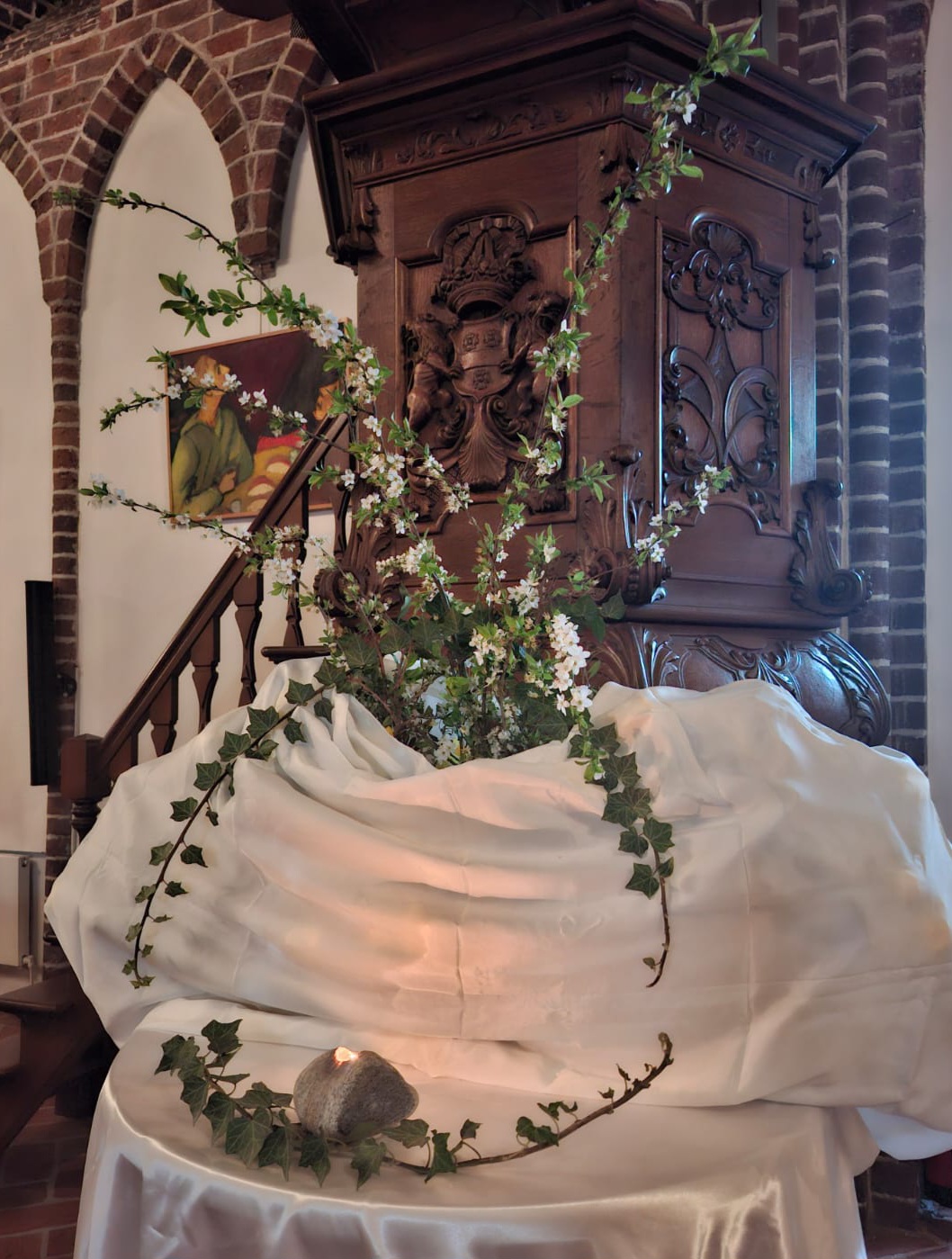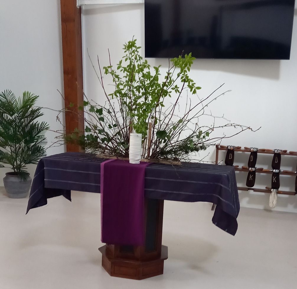 ![]() Liturgische schikking Stille Zaterdag in de Goldhoornkerk in Oostwold Uitleg schikking (Gemaakt door Zwanie Akkerman) ![]() in De Ontmoeting in Scheemda (Gemaakt door Katrien en Ludolf Niemeijer) Enkele takken staan voor de zorg voor het lichaam. De doek is een verwijzing naar de balseming en het neerleggen in het graf. Door de doek is het leven niet meer zichtbaar. ![]() ![]() in de Marktpleinkerk in Winschoten Uitleg schikking (Gemaakt door Janny Geertsema-Kieft) | ||