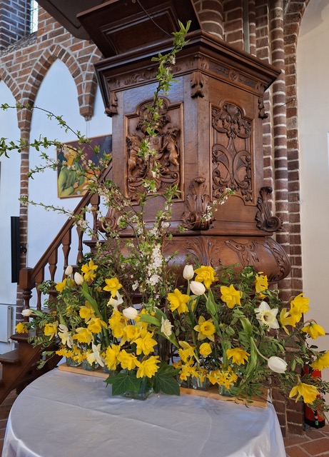 ![]() Liturgische schikking Pasen in de Goldhoornkerk in Oostwold Uitleg schikking (Gemaakt door Zwanie Alkkerman en Lineke Hut ) ![]() Scheemda De Ontmoeting (Gemaakt door Katrien en Ludolf Niemeijer) Pasen, een bloeiende tuin vol bloemen van het beginn, inspiratie voor een brede beweging. ![]() in de Marktpleinkerk in Winschoten Uitleg schikking (Gemaakt door Janny Geertsema-Kieft) | ||